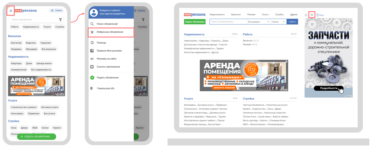 - на смартфоне – выберите раздел "Избанные объявления" в пользовательском меню.