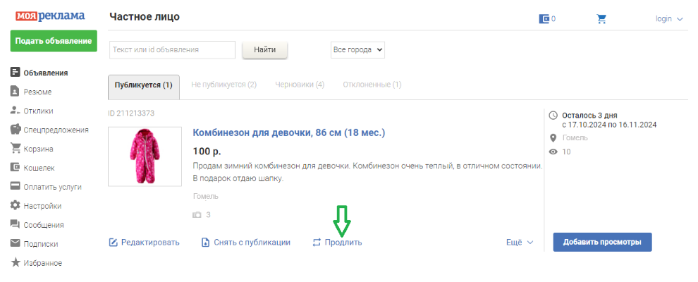 Аналогично можно возобновить публикацию уже завершенного объявления, кликнув на соответствующую ссылку Публиковать под выбранным объявлением.