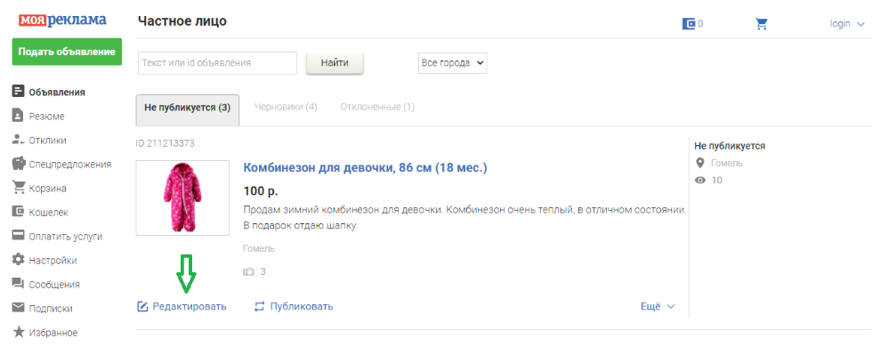 В личном кабинете выберите нужное объявление, нажмите "Редактировать" или кликните по тексту объявления. В открывшейся форме заполните поля, которые вы хотите изменить. Нажмите кнопку "Сохранить".
