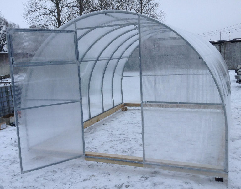 имеет ширину от 3 м до 3,5 м, поэтому ее площадь на 15% больше чем у 3-метровых аналогов. Высота 2 м. Теплица изготовлена из замкнутой оцинкованной трубы сечением 20х20 мм, либо 40х20, толщина стенки 0.8 мм. Дуги устанавливаются с шагом от 0.67 м до 0.5 м. Дуги изготавливаются цельными и соответственно имеют большую прочность и жесткость в отличие от разборных аналогов. Каркас выдерживает снеговую нагрузку не менее 180 кг/м2. Максимальная снеговая нагрузка для г. Гомеля 130 кг/м2. Теплица не требует уборки на зиму и очистки от снега. Теплица может устанавливаться как на фундамент, так и на землю. В комплекте фурнитура для крепления. Возможно изготовление теплицы из трубы 20х20 мм с толщиной стенки 2.0 мм либо с профтрубы 40х20 мм. черного металла. В этом случае стоимость теплицы будет выше на 150 р. (4 м), 200 р. (6 м), 250 р.(8 м), 300 р. (10 м), 350 р. (12 м). Также по желанию клиента дополнительно укомплектуем теплицу стеллажами, доп. форточками, новый товар.