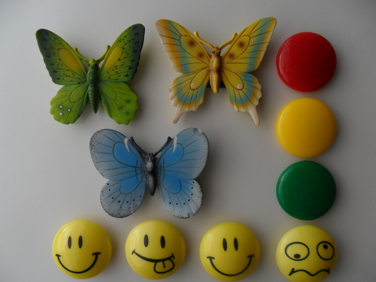 Бабочки-керамика, эмоции-пластик, светофор-пластик.