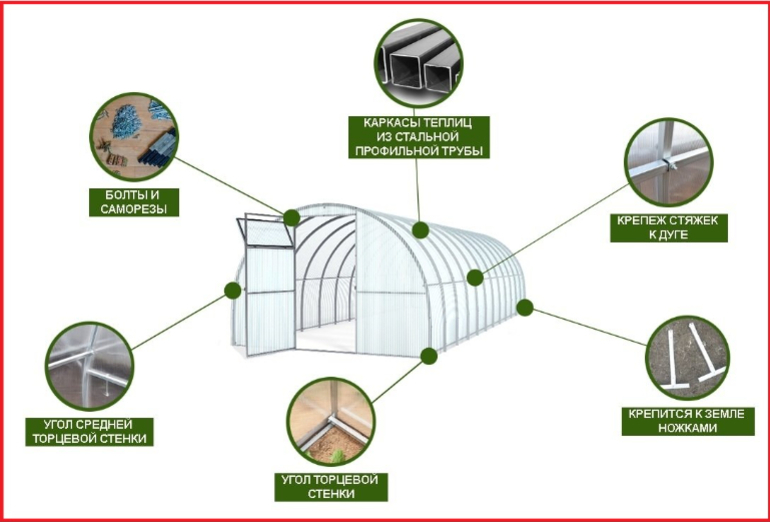 Так же предусмотрены грунтозацепы ( ножки которые служат как якорь) для установки теплицы без фундамента на грунт.