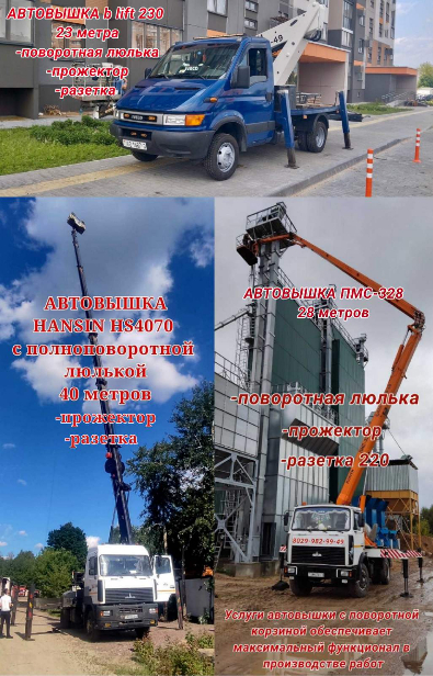 Автовышки (с высотой подъёма 40 метров) коленчатая, телескопическая с поворотными люльками (корзинками).