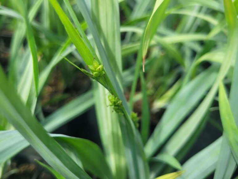 Осока Банни Блю имеет голубоватые, плотные, шириной до 6 мм и длиной около 20 см листья. В период цветения появляются небольшие колоски. Является одним из самых зимостойких растений данного вида.