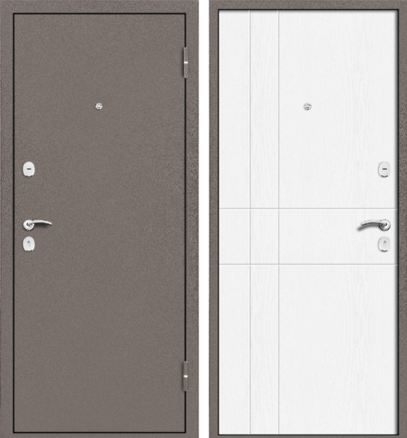 Комплект:Дверное полотно, коробка, замки - в сборе; ручки; 4 ключа от верхнего замка / 5 ключей от нижнего замка; глазок