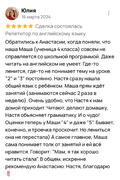 Помогу подтянуть знания, решить домашние задания, объясню непонятные темы. Свободно владею языком и смогу развить этот навык у ребёнка.