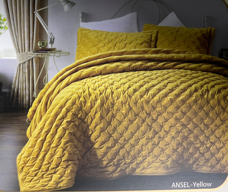 Двуспальное велюровое покрывало ARYAhome ANSEL-yellow (250X260) с двумя наволочками (50X70+5) жёлтого цвета с ромбовидным узором по всей поверхности. Мягкое бархатное и приятное на ощупь. Комплект из коллекции Ansel от официального турецкого производителя домашнего текстиля Arya home – роскошное украшение вашей спальни, а также - идеальный подарок на новоселье, свадьбу, на день рождения или юбилей, новый товар.