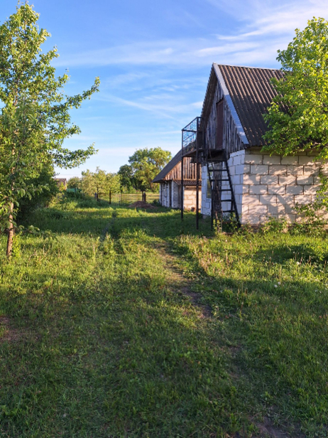 На участке деревянный дом. Летняя кухня из ПГС. Хоз. постройки. Фруктовые деревья.