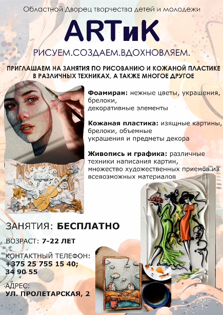 Приглашаем на занятия «АРТиК» по рисованию, кожаной пластике, фоамирану в областной Дворец творчества детей и молодежи. С 7 до 22 лет. Занятия два раза в неделю. Бесплатно! УО "Гомельский государственный областной Дворец творчества детей и молодёжи"., УНП 490085516.
