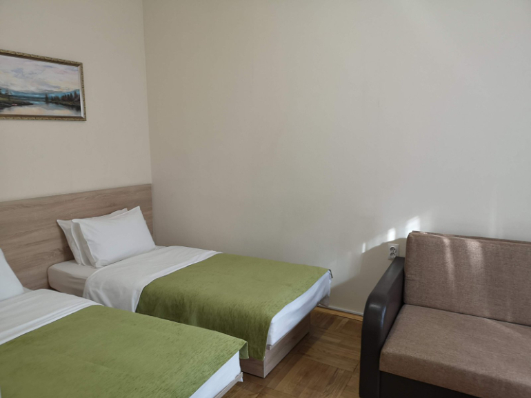 Площадь номера 24 кв.м., две одноместные кровати (90х200) или двухместная кровать (180х200), телевизор, холодильник, кресло-кровать, диван, шкаф, электрический чайник, чайная пара.