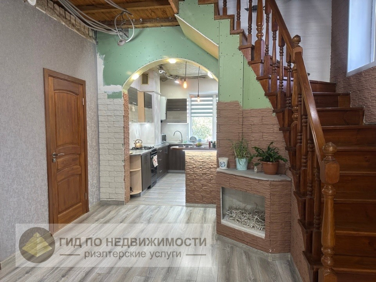 В доме два жилых этажа. На 1-м этаже просторная гостиная 21м2, кухня 13,6м2 и санузел. На 2-м этаже две спальни и просторный санузел с сауной.Дом 1995 года постройки. Крыша – шифер. Стены дома и перекрытия между этажами – железобетонные плиты. Окна ПВХ. На второй этаж ведет удобная деревянная лестница. В комнатах выполнен хороший ремонт, с отделкой из натурального дерева, межкомнатные двери – массив. Встроенная кухня. Все коммуникации (свет, вода, газ) заведены в дом, канализация местная.В доме установлен газовый двухконтурный котел, который обеспечивает нагрев горячей воды и регулирует температуру в доме в любое время года.