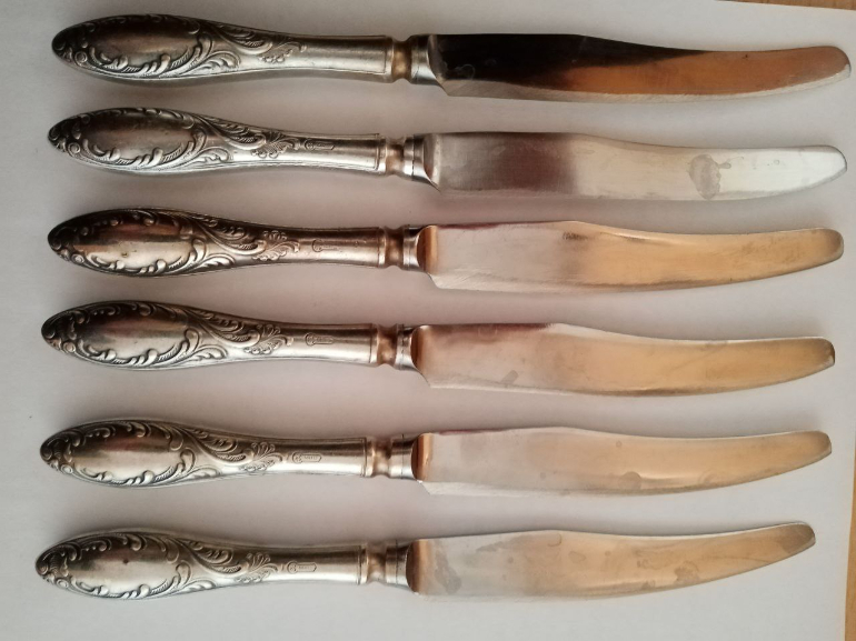 Ножи столовые, мельхиоровые, есть клеймо МНЦ, можно прочесть, длина 21 см. За все 6 шт 90,00 руб.