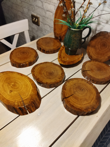 Спилы из дуба для декора, подставок ,полок и мн. другое на ваше усмотрение. Есть покрыты лаком , есть обожженные не покрыты лаком. Также можем сделать под заказ., новый товар.
