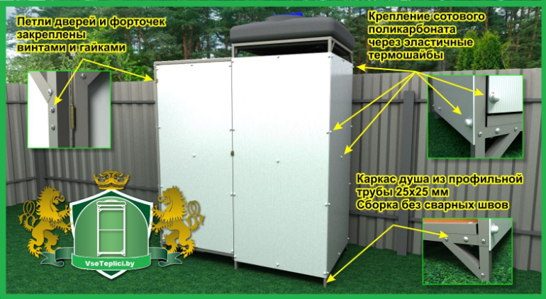 Садовый душ Престиж из оцинкованной трубы 25х25. Это конструкция душа имеющая ряд преимуществ над конкурентами. В данном садовом душе нет сварных швов , в условиях постоянной влаги и агрессивной среды места соединений не ржавеют. Для жесткости всей конструкции применяют диагональные укосины. На пол укладывается не просто доски , а деревянный щит собранный на заводе. Данный щит имеет большую жесткость при использовании. Петли данного душа крепятся болтовым соединением. Они не провиснут и при сильном ветре если оставили открытой дверь ее не вырвет в отличии от саморезов. Защелки на дверях стоят не только с наружной стороны но и с внутренней, что бы комфортно было принимать водные процедуры. Душ с тамбуром имеет в комплекте шторку. Которая сохранит одежду и полотенце сухими. Фиксируется садовый душ на участке при помощи грунтозацепов. Они вкапываются в землю, тем самым позволяют не делать фундамента и переставить душ при необходимости. Высота душа увеличена, так как после установки бака лейка забирает высоту. При росте выше 180 см это будет ощутимо. Сотовый поликарбонат крепиться не кровельными саморезами, а специальными термошайбами. Дачный душ Агро и Престиж, Это садовый душ с тамбуром и без тамбура. Бак на выбор от 55 до 200 литров с подогревом и без подогрева. Различные модели Агро, Престиж, Комфорт. Усиленный каркас с раздевалкой и без. Комби. Прочный, защищённый от ржавчины каркас из стальной оцинкованной трубы. -Вся необходимая фурнитура входит в комплект. -Пол из натуральной обрезной доски обладает естественным теплом природного материала и приятен для ступней. -Стенки и дверь покрыты качественным сотовым поликарбонатом молочного цвета, который делает дачную душевую кабину светлой внутри и, при этом, надёжно скрывает Вас от посторонних глаз. Каркас: стальная труба 20х20мм или 25х25 мм усиленный вариант. Защита каркаса от ржавчины: оцинкованная труба как с наружи так и из внутри. Поддон: сухая обрезная доска (без покрытия). Длина: 0,95. Ширина: 0,95 м - без тамб, новый товар.