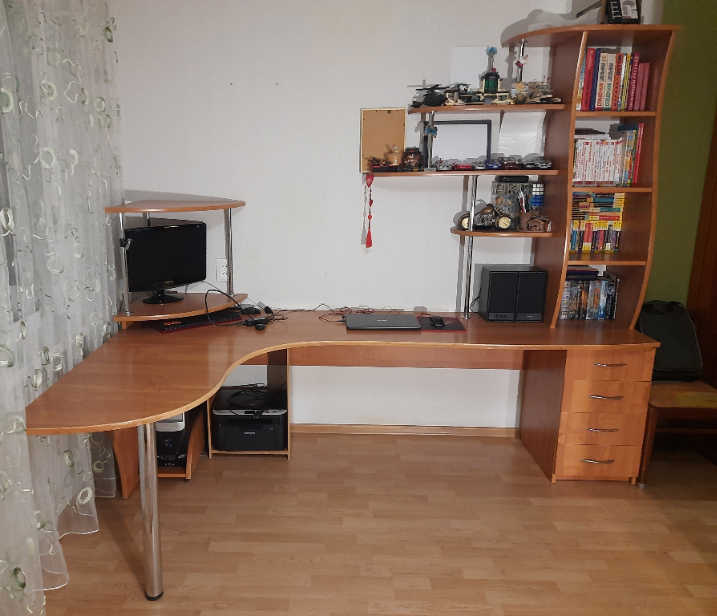 Продам б/у угловой стол компьютерный (письменный) в отличном состоянии, всё целое, без трещин и сколов, выдвижные ящики исправны. Идеально подойдёт для работы, учёбы даже 2 человек, просторный, вместительный. Длина 250 см, ширина 155 см, высота от пола до верхней полки 200 см, высота от пола до крышки стола 72 см, глубина самой крышки стола 60 см. Без подставок для компьютера и принтера (слева внизу фото). Самовывоз с Сельмаша.