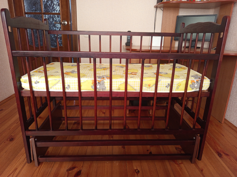 Кроватка-маятник, состояние новой. Вместе с кроваткой отдадим бортики, матрас, постельное, балдахин. Находится в д.Климовка Гомельского района.