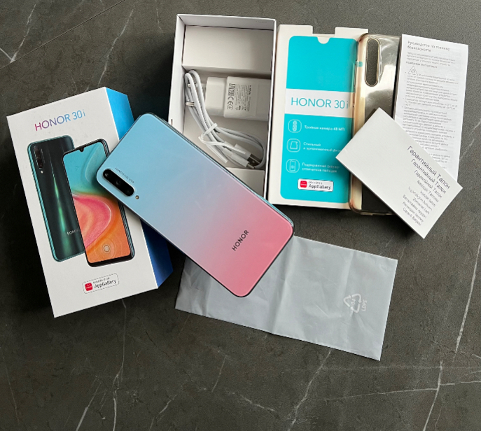 Этот тонкий и стильный аппарат с тройной основной камерой может похвастать AMOLED-экраном с тонкими рамками. Очень лёгкий. Имеется функция «защита зрения». Лицевая поверхность экрана выполнена в виде стеклянной пластины с антибликовым свойством и зеркально-гладкой поверхностью, устойчивой к появлению царапин. Цвет перламутровый, переходящий от небесно-голубого сверху к нежно-розовому вниз, смотрится очень красиво. Возможность использовать две сим-карты. В отличном идеальном рабочем состоянии. Без сколов и дефектов. Отвязан от всех аккаунтов. Всё paбoтaeт без нaрeкaний, с момента покупки смартфон всегда в чеxле и c защитным cтeклом. В комплектe всё от изготовителя: коробка, зарядное устройство, шнур к нему, руководство по эксплуатации, гибкий и абсолютно прозрачный чехол, что позволяет лицезреть и цвет, и дизайн самого устройства без преград.