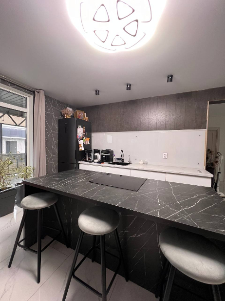 Кухня со всей техникой: холодильник, плита, микроволновка, чайник.