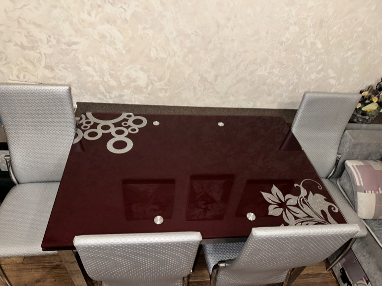 Стол из закаленного стекла, бордовый-серебро. Состояние отличное. Большой-140х74 в сложенном виде, разложенный-170х74. Стулья на металлическом каркасе. Жд район.