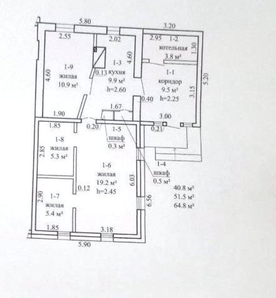 Общая площадь квартиры составляет 51.5 кв.м., из которых 40 кв.м. приходится на жилую зону, разделенную на 4 комнаты.