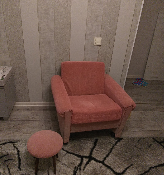 Кресло компактное, удобное, на колёсиках. Имеются незначительные дефекты обивки. Можно для дачи и др.целей. Крепкое. Можно с пуфиком. Есть ещё одно за такую же цену. На фото более яркий цвет, по факту более тусклый.