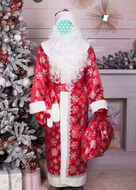 Костюм Деда Мороза. Комплект: шуба, шапка, пояс, варежки, борода, мешок.