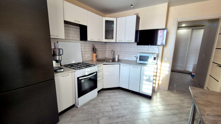 - огромная площадь для однокомнатной квартиры 47,2 м2 (комната 19,4 м2, кухня 9,8 м2, широкий балкон 3,7м2, сан.узлы 4,2 м2 + 2,0 м2, коридор 7,2 м2);