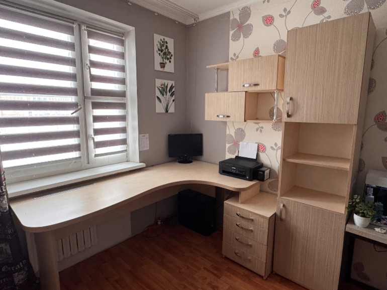 Стол угловой письменный (компьютерный) с навесным шкафчиком и пеналом. Мебель изготавливалась на заказ. Столешница толщиной 39 мм. Все размеры на фото. Есть небольшие дефекты. Самовывоз. Цена 550 бел. руб.