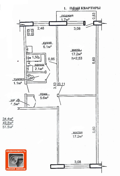 Жилая площадь:34,4 м²