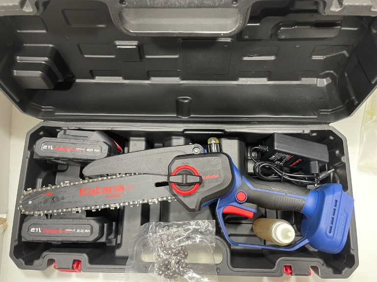 Пила цепная аккумуляторная KATANA AP2210PRO-1 21В,2x2Ач, Бесщёточный двигатель, шина 20см, защитный кожух, смазка цепи, бесключевая система натяжки цепи, кейс.