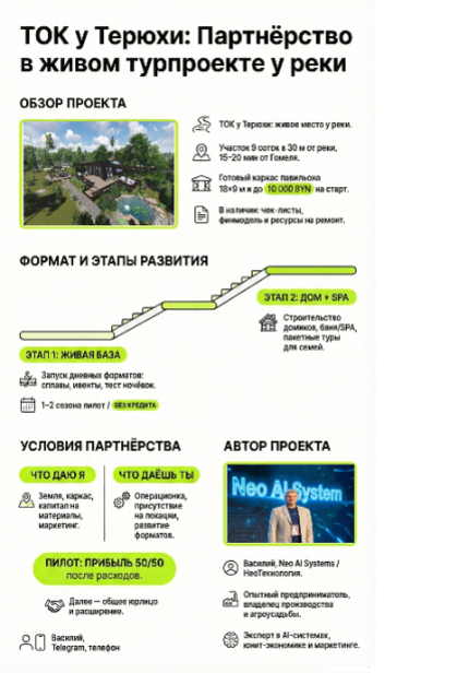 – при выходе на стабильные показатели рассматривается совместное юрлицо и расширение (домики, SPA, кредит/инвестор уже на работающий проект).