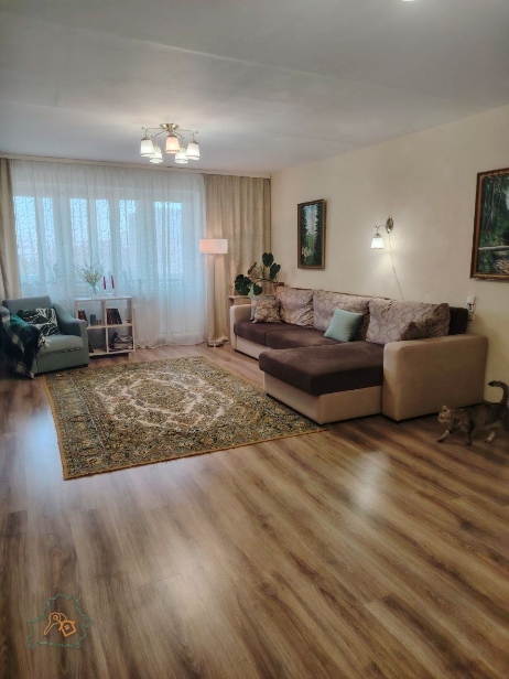 Общая площадь 99,0 м.кв., жилая 57,9 м.кв. кухня 11,6 м.кв. Санузел раздельный. В квартире выполнен косметический ремонт. Окна частично ПВХ, частично деревянные стеклопакеты, в том числе и на лоджиях, на полу везде ламинат, в кухне, в ванной и в санузле, прихожей – плитка. Потолки – окрашены. Межкомнатные двери сосна плюс шпон дуба, входная дверь- металлическая.