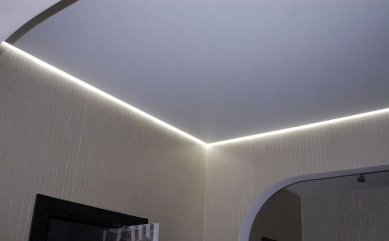 Это обычный натяжной потолок, но с одной хитростью: он крепится не к стене, а чуть ниже. По краю остаётся зазор, куда прячется подсветка.