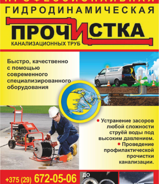 Гидродинамическая прочистка канализации – это обработка внутренней полости труб струей воды под высоким давлением (обычно в интервале 100-200 атмосфер). Под сильным напором поверхность ошкуривается, как если бы вы работали щеткой. Труба, полностью освобожденная от осадка, обладает свойством самоочистки, как новая. После промывки налет на стенках образуется нескоро., УНП 490870756.
