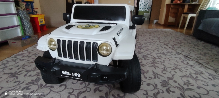 В хорошем состоянии, покупали 2 года назад б/у. Батарея держит 1-1,5 часа, в зависимости от скорости и местности передвижения. Сигнал, свет, музыка мр3. Три скорости вперед и одна задняя. Пульт ДУ. есть режим качалки. Мягкие колеса. Находится в Поколюбичах Гомельского района.