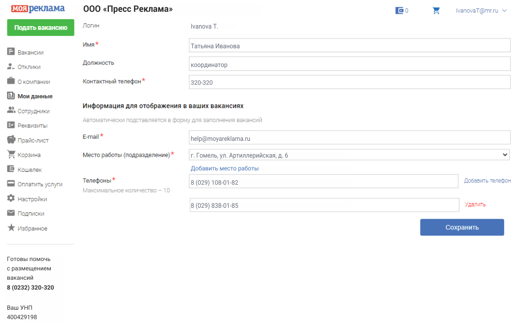 Поля "Имя", "Должность" и "Контактный телефон" не отображаются в вакансиях и используются только сотрудниками сайта для связи с администратором кабинета.